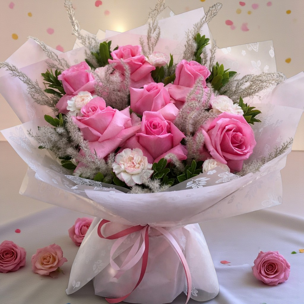 Buqetë elegante me trëndafila rozë, ideale për dhuratë,