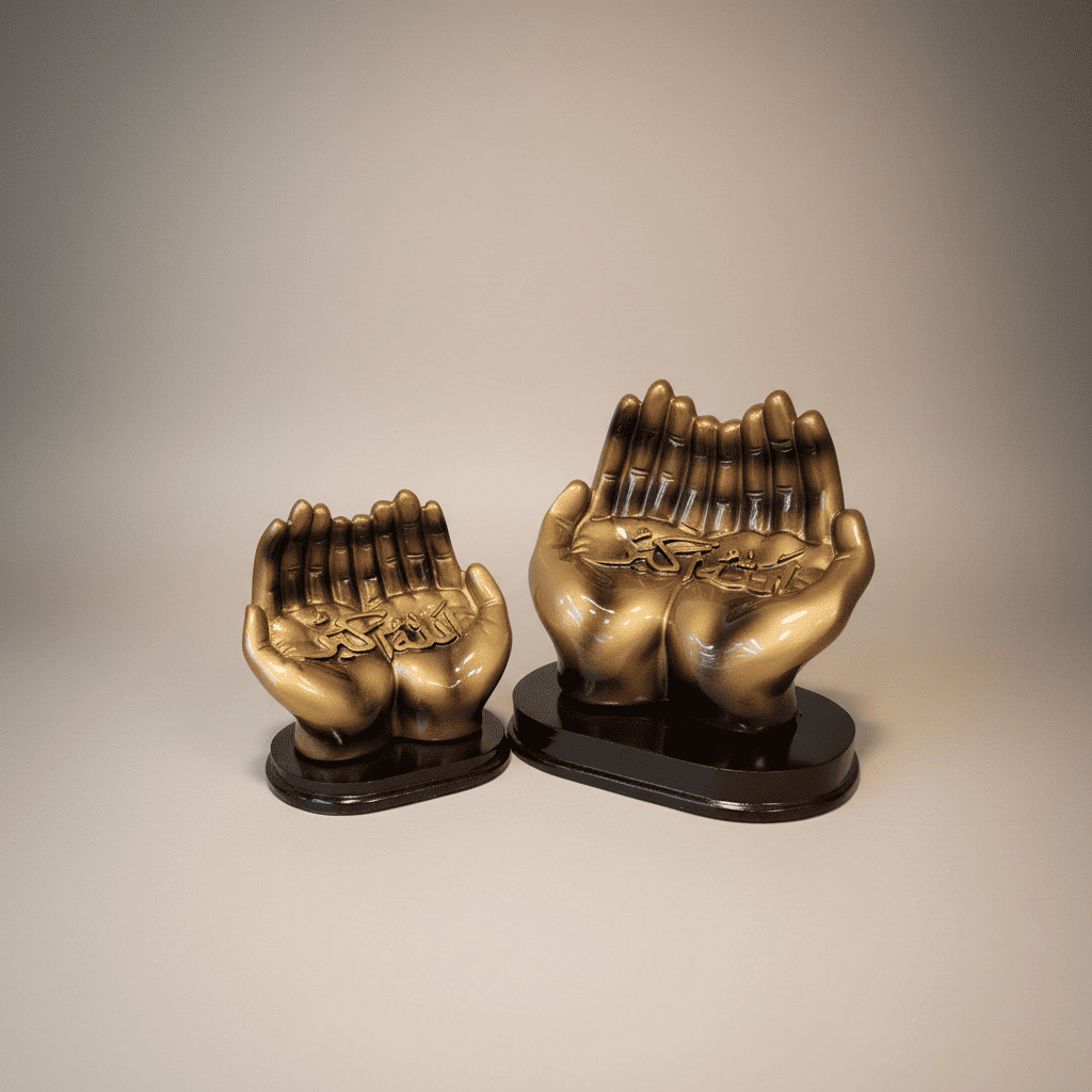 Dekor me duar lutjeje në ngjyrë ari, i përshtatshëm për ambient shtëpie gjatë Ramazanit. Ide perfekte për dhuratë shpirtërore dhe festive për Bajram.