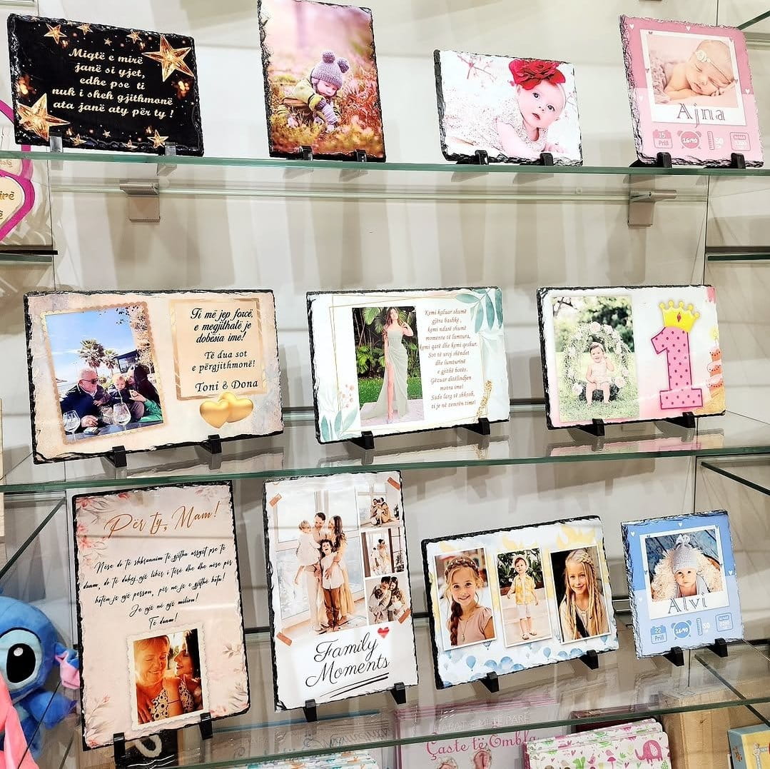 Foto të personalizuara të stampuara në gur natyral, ideale për dhurata unike dhe kujtime të veçanta. Zgjedhje perfekte për familje, çift, fëmijë dhe raste speciale.