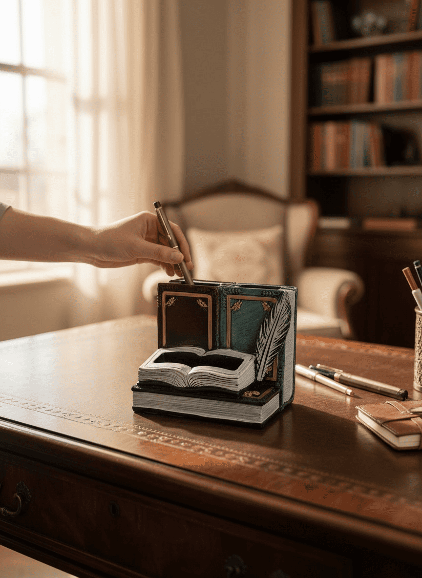 Mbajtëse stilolapsash me dizajn unik në formë librash, ideale për tavolinë pune apo zyrë. Zgjedhje perfekte si dhuratë për mësues, studentë apo dashamirës të librave.