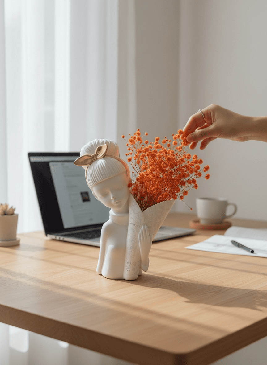 Vazo dekorative me dizajn unik në formë vajze, ideale për ambiente shtëpie apo zyre. Shton stil dhe është një dhuratë perfekte për çdo rast.